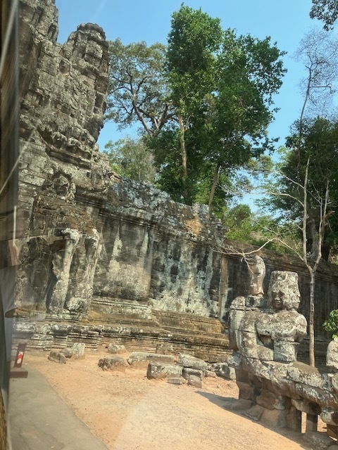 KLOOK社のSUNRISEツアーに参加しました。タプロームなどに寄った後、最後はバイヨンなどがあるアンコール トムに向かいました。アンコール トムは城壁で囲まれていてたくさんの門がありますが、この勝利の門からアンコール トムに入場しました。まっすぐ進んで王宮に出ました。クメール軍の勝利を王に報告するための凱旋門だったそうです。