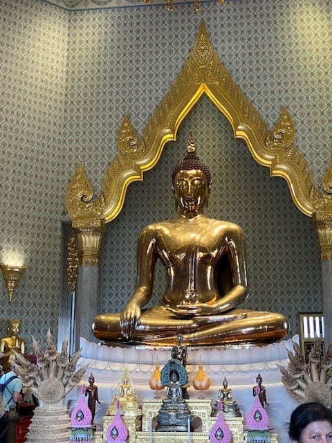 バスに乗ってヒンズー教の祠のエラワン廟から黄金仏寺として有名なワット・トライミットへ行きました。バスを降りると目の前に黄色のワット・トライミットの本堂が見え、多くの方がこの塔の外側の階段を登っているのが見えました。この建物に登るには右側にあるチケット売り場で100バーツ支払いが必要です。一番上の4階にご本尊の黄金物が鎮座しています。そんなに大きくはないですが、ピカピカです。