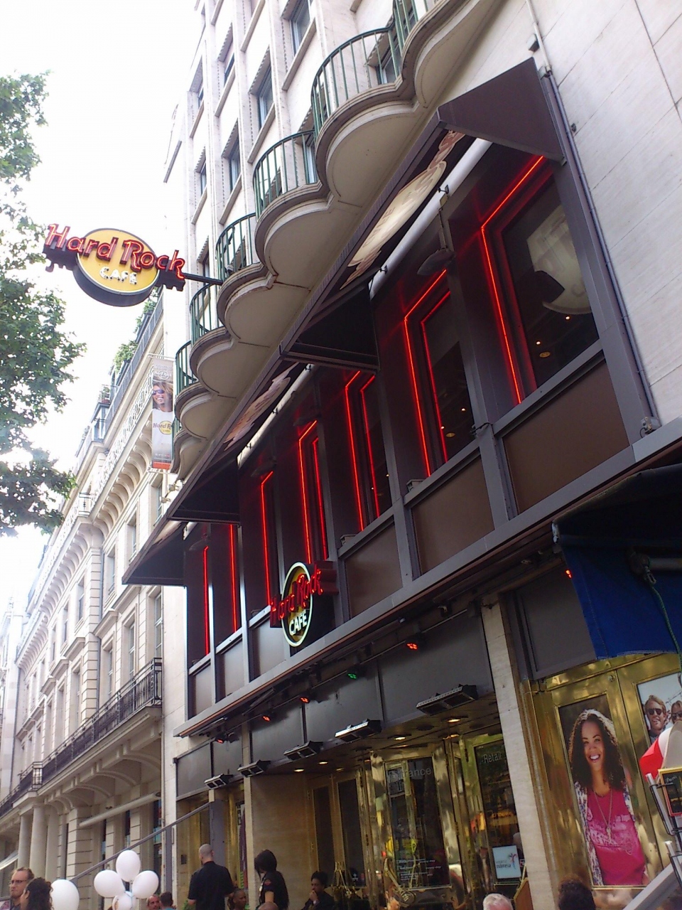 世界中にあるハードロックカフェのパリ版です。モンマルトルの丘にあるサクレ クール寺院に行ったついでに寄ってみました。サクレ クール寺院からは、2キロほど続く下り坂をほぼまっすぐに下って行きます。途中、パッサージュ ジョフロアというアンティークなカーケード商店街があり、そこを抜け大通りに出てすぐ右側にあります。ドアの扉がギターの形をしています。ピンバッチを購入して終わりましたが、いつものハードロックカフェでした。