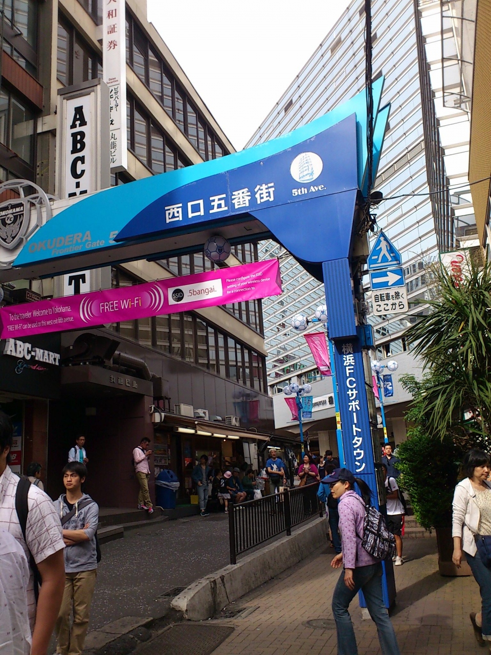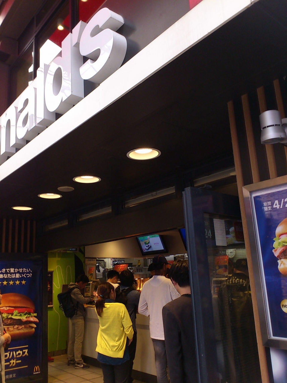 横浜駅の西口、相鉄の改札を出ると横浜西口5番街があります。そこの商店街の中にあるマクドナルドです。交差点の角にあり、この道自体が人通りが多いので、注文が溜まると、お客は道路にはみ出しています。1階は注文を取るだけで、店舗は2階から4階へと階段を登ります。