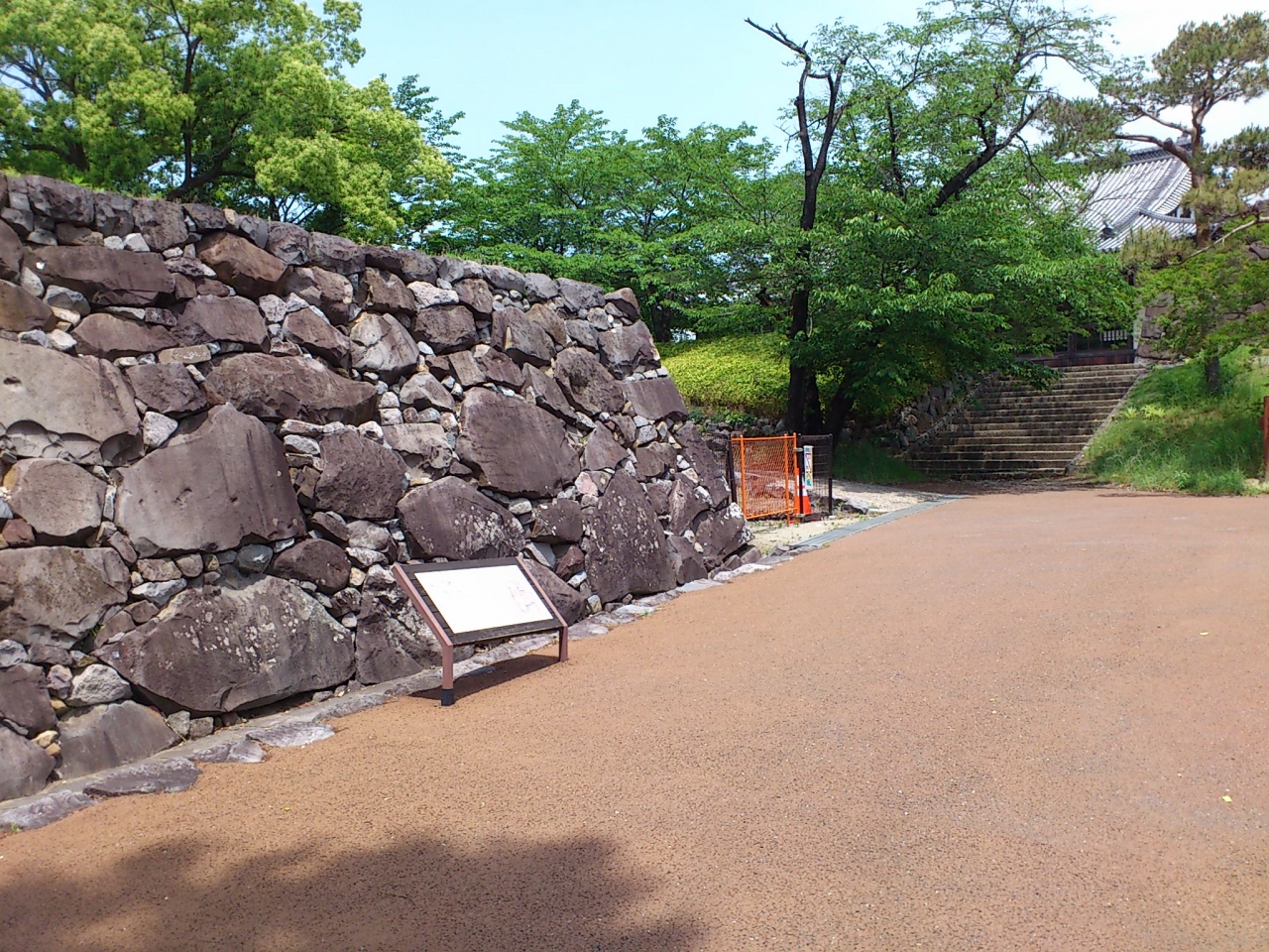 甲府城は立派な石垣や天守台跡がありますが、建物は意外と少なく、稲荷櫓ぐらいしかありません。天守台のあるところから、坂を下って行くとこの稲荷曲輪に出ます。広々と整備された広場です。トイレもここにあります。