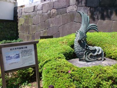 大手門には門が2つあり、お堀側の高麗門と奥の大手渡櫓門があります。奥の方の大手渡櫓門の屋根にあったという鯱が置かれています。鯱は普通屋根の上にあるので、目の前でしげしげと見る機会はあまりないと思います。
