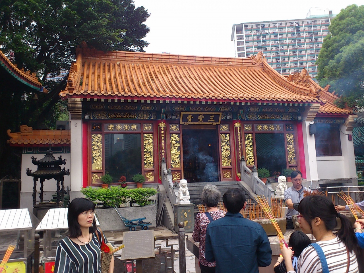 香港のパワースポットの嗇色園黄大仙廟の中にあるお堂です。黄大仙廟は黄大仙が祀られている本堂の黄大仙大殿平台→三聖堂→盂香亭の順に参拝する順路になっています。この三聖堂には呂祖先師と観音菩薩、関聖帝君が祀られています。呂祖先師は八仙のひとり呂洞賓のことで、関聖帝君は三国志の武将の関羽です。