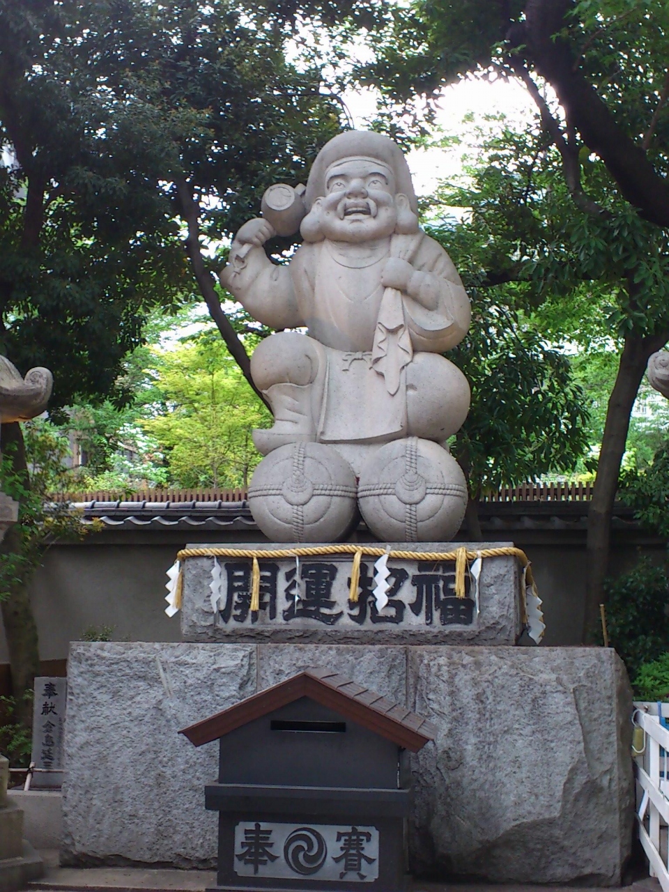 神田明神の門をくぐって、左側にある大きなだいこく様の像です。にこやかに笑っているだいこく様のお姿はとてもご利益がありそうですし、なぜか心も和む感じがしました。石造りとしては日本一のだいこく像だそうです。近くには波乗りをしている様な形のえびすさまの像もあります。