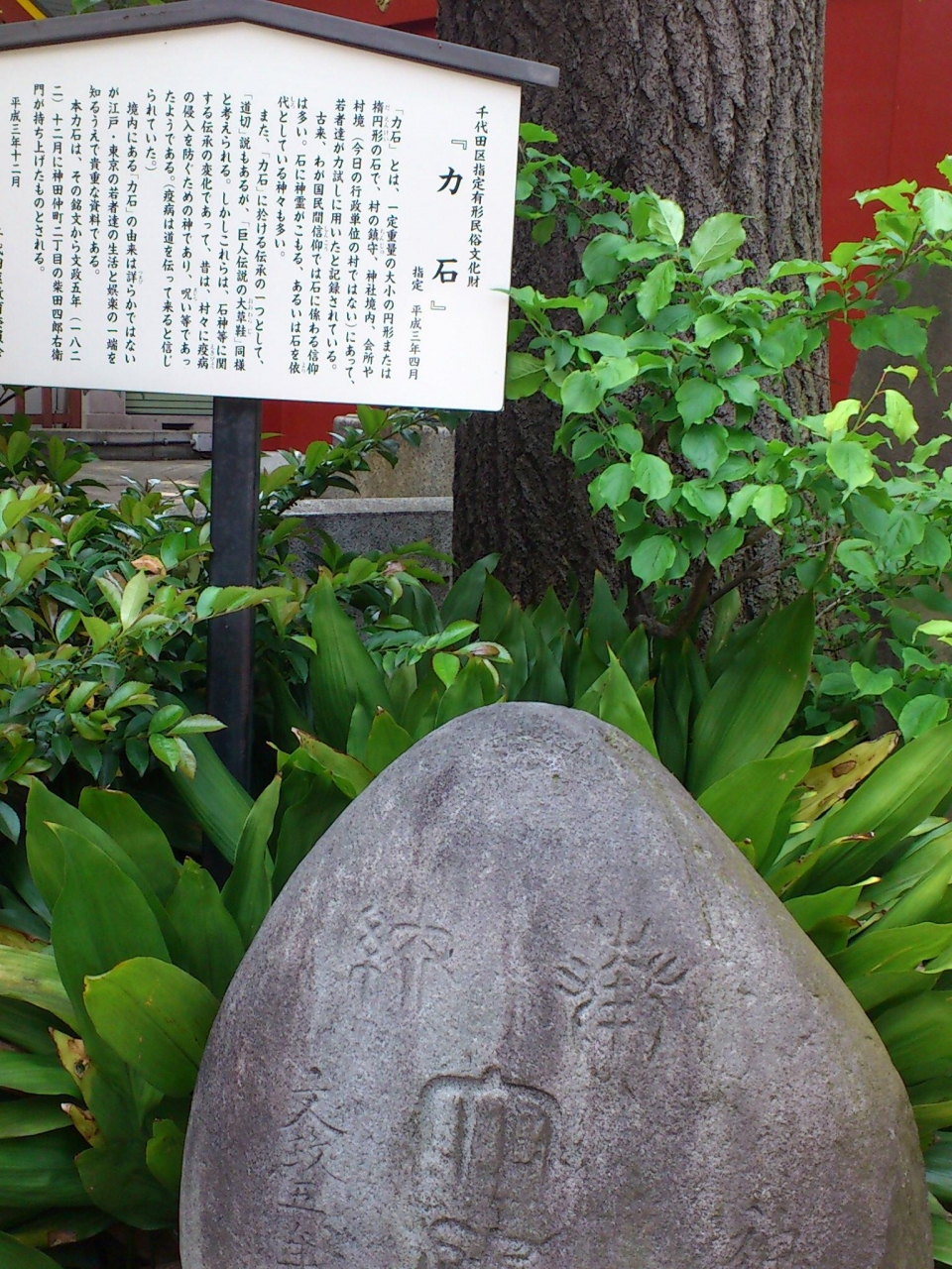 神田明神の本殿に向かって左手には末社がたくさんあり、石碑もたくさんあります。その中にこの力石も置かれています。若者たちが力くらべに使った2~30貫くらいの石だそうです。文政5年間に神田仲町二丁目の柴田四郎右衛門氏が持ち上げたものとかいてあります。
