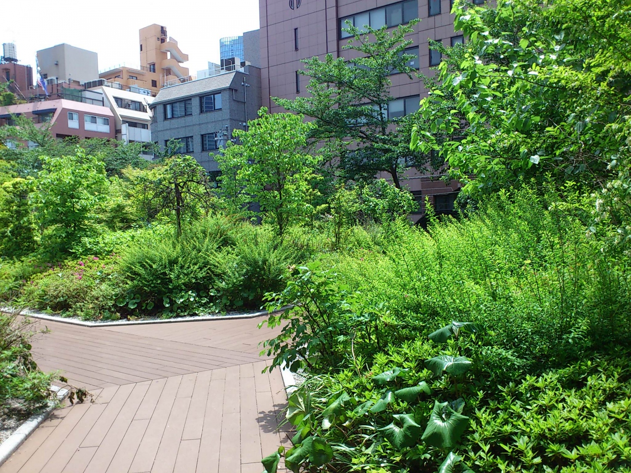 神田明神の駐車場は、本殿を正面に見て左側にありますが、その屋上が屋上庭園として整備されています。屋上と言っても2階の部分です。5月に訪れたので、結構植物が生えていました。神田明神の緑化事業として始めたものだそうです。