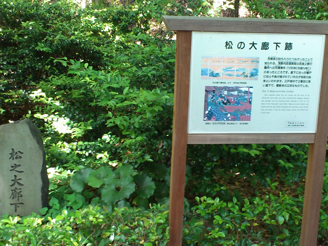 赤穂浪士の討ち入りで有名な松の廊下です。当時はこの廊下の襖に多くの松の絵が描かれていたので、松の廊下という名前がついたそうです。浅野内匠頭が吉良上野介に切りつけた刃傷の場ですが、今は建物も何もなく、草むらに看板だけが残っています。わざわざ行きましたが、単に看板を読みに行ったのと同じでした。