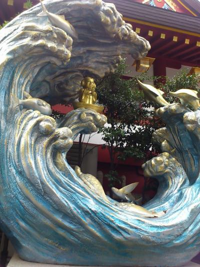 神田明神の中にある恵比寿様の像です。鳳凰殿竣成記念として製作されたそうです。大黒様の像の近くに建っています。サーファーのように波乗りをしているような恵比寿様の像で、とても珍しい形だと思います。水色が目立つので、すぐに見つけることができると思います。
