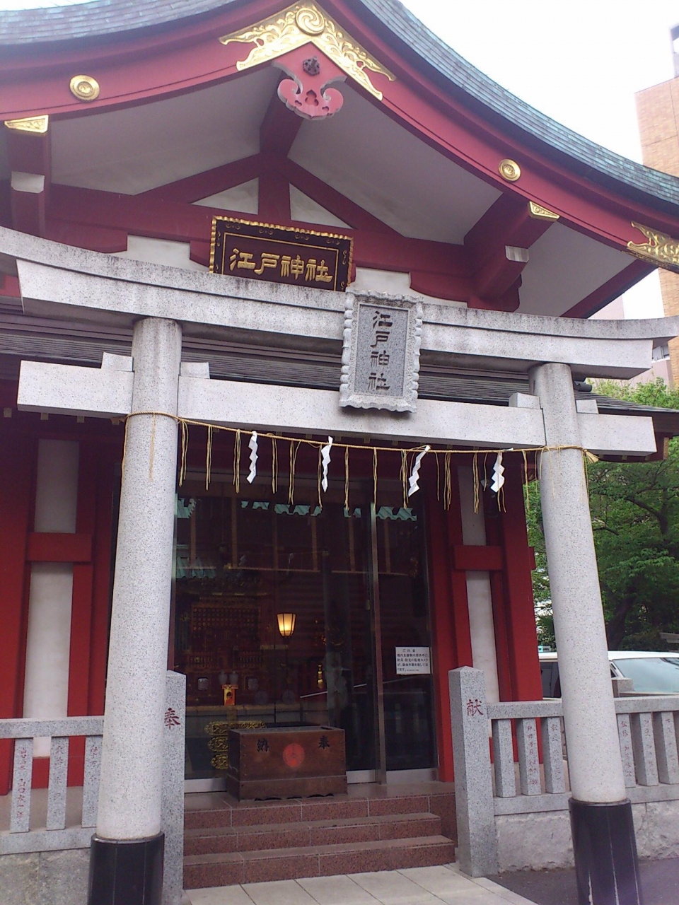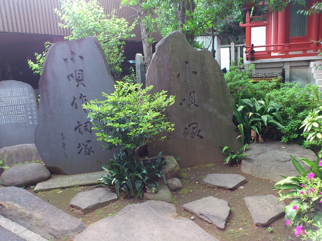 神田明神の中にある石碑です。小塚と言う名前が付いていますが、石碑が2つ並んで建っているだけです。神田明神の鳳凰殿の裏には、江戸神社や魚河岸神社などの末社がたくさん並んで建っていて、その端のところにこの石碑が建っています。