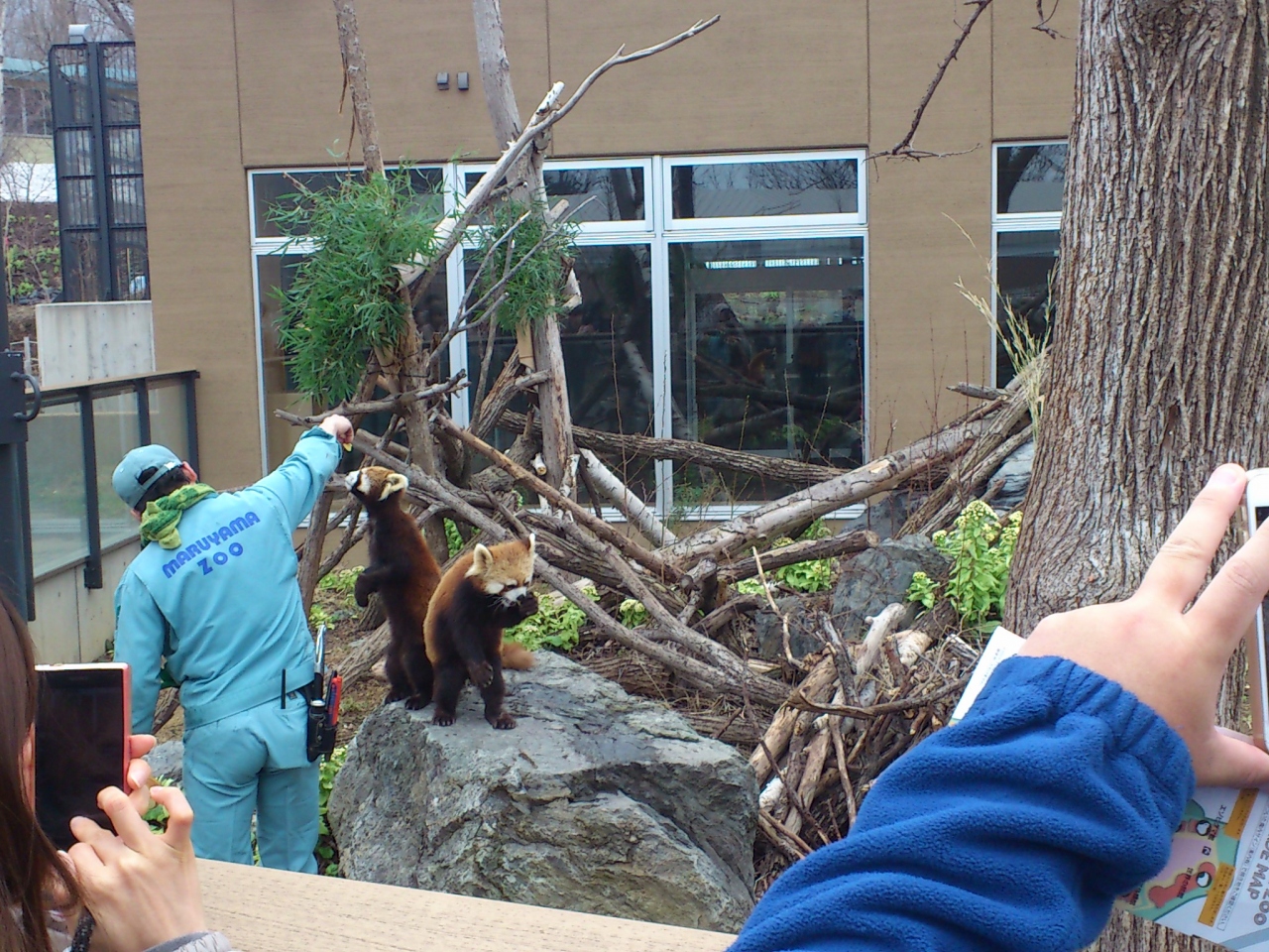 4月中旬に札幌の円山動物園へ行きました。まだ肌寒い感じで多くの動物は屋内の飼育場の中に入ったままでした。外に出ていたのはシロクマと西門出入り口の近くに有るこのわくわくホリデーアジアゾーン高山館のレッサーパンダぐらいでした。ちょうど餌やりの時間でした。