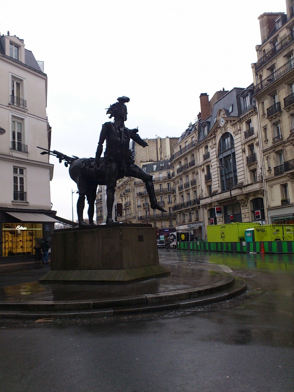 奇跡のメダイ教会からオルセー美術館美術館まで歩いて移動する途中にあった広場です。多くの通りが交差する場所で、広場という名前が付いていますが、そんなに広くはありません。小雨が降っていたので、通り過ぎただけですが、ケンタウルスの像が印象的でした。