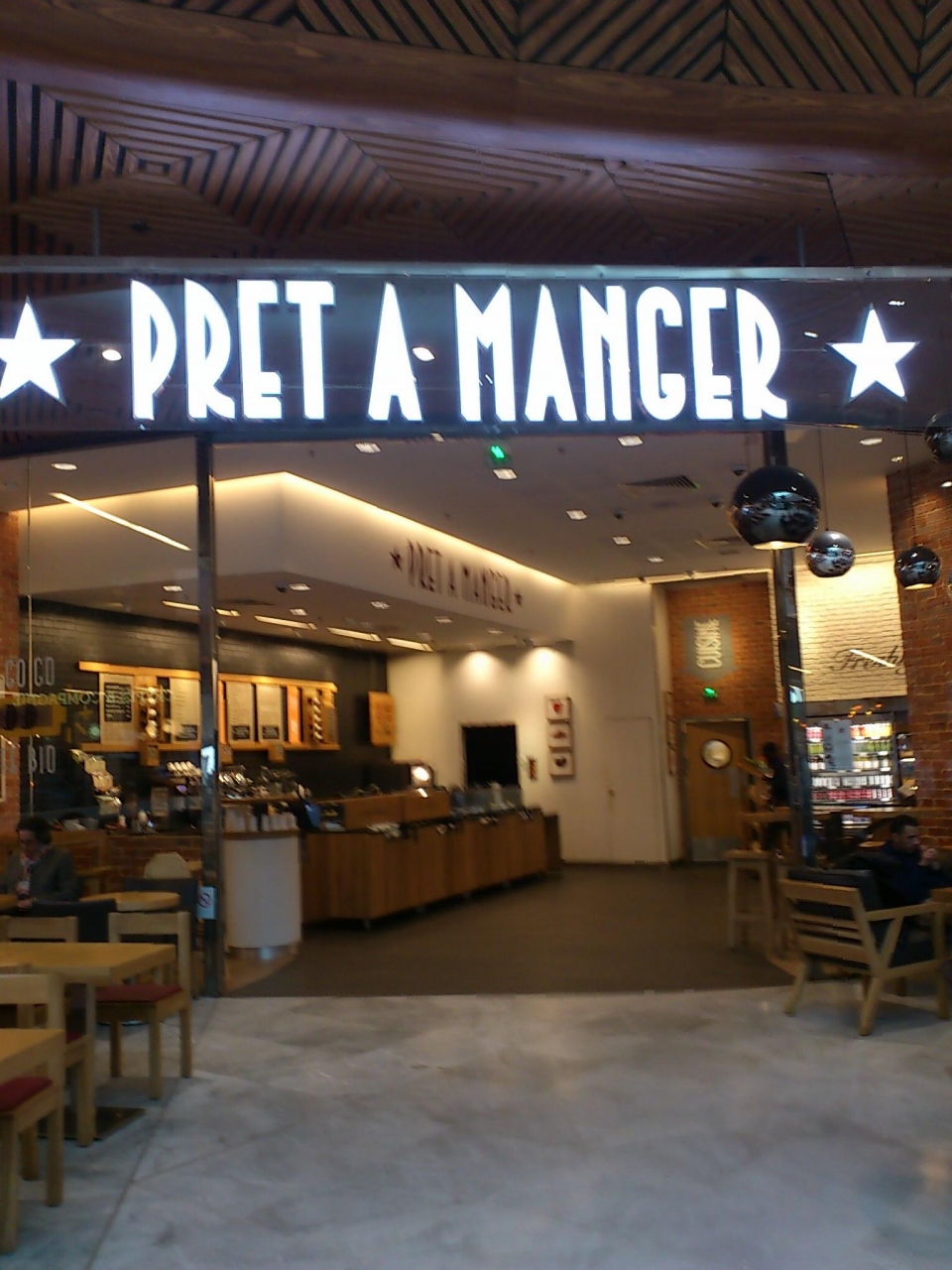 パリのシャルルドゴール空港の近くにできたエアロビルというショッピングモールの中のフードコートの中にあるお店です。地下の駐車場から登ってくるエスカレーターのすぐ前にあります。プレタ・マンジェ(Pret a Manger)は、サンドイッチを主力商品とするイギリスのファーストフードチェーンだそうです。多くの方がここのテーブルでコーヒーを飲みながら、一休みしていました。私もエスプレッソで一休みさせてもらいました。