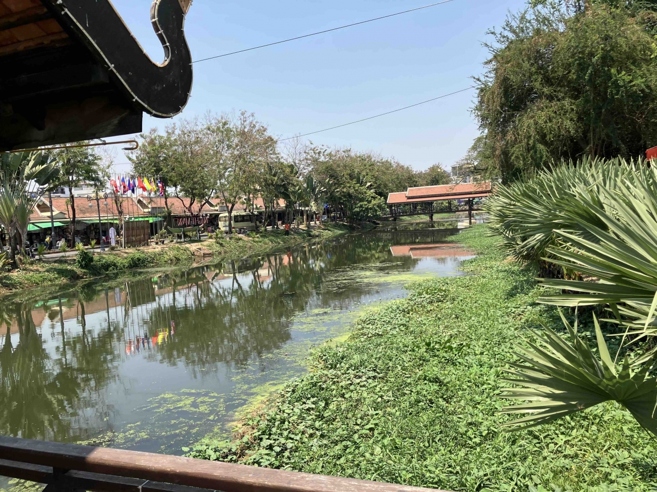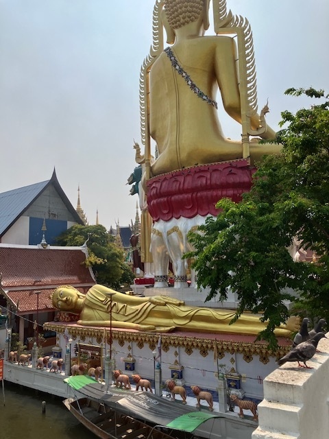 MRTのBang Phai駅から歩いて15分ほどで到着しました。最後は川を跨ぐ面白い形の橋を渡りました。ワット パークナムの境内に入るとものすごい人出でした。白い大きな大仏塔、びっくりするほど大きな黄金大仏など見どころたくさんでした。人気があるのもわかりました。