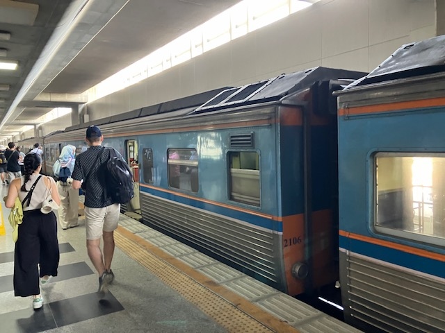 ワットアルンを参詣した後にチャオプラヤーエクスプレスボートに乗ってチャオプラヤー川の対岸にまで渡りました。船着場の建物から外に出ると、このサナームチャイ駅の入口がありました。そこからかなり深い地下までエスカレーターで降りて行きます。ワットアルンへはこの地下鉄+チャオプラヤーエクスプレスボートの組み合わせが便利です。