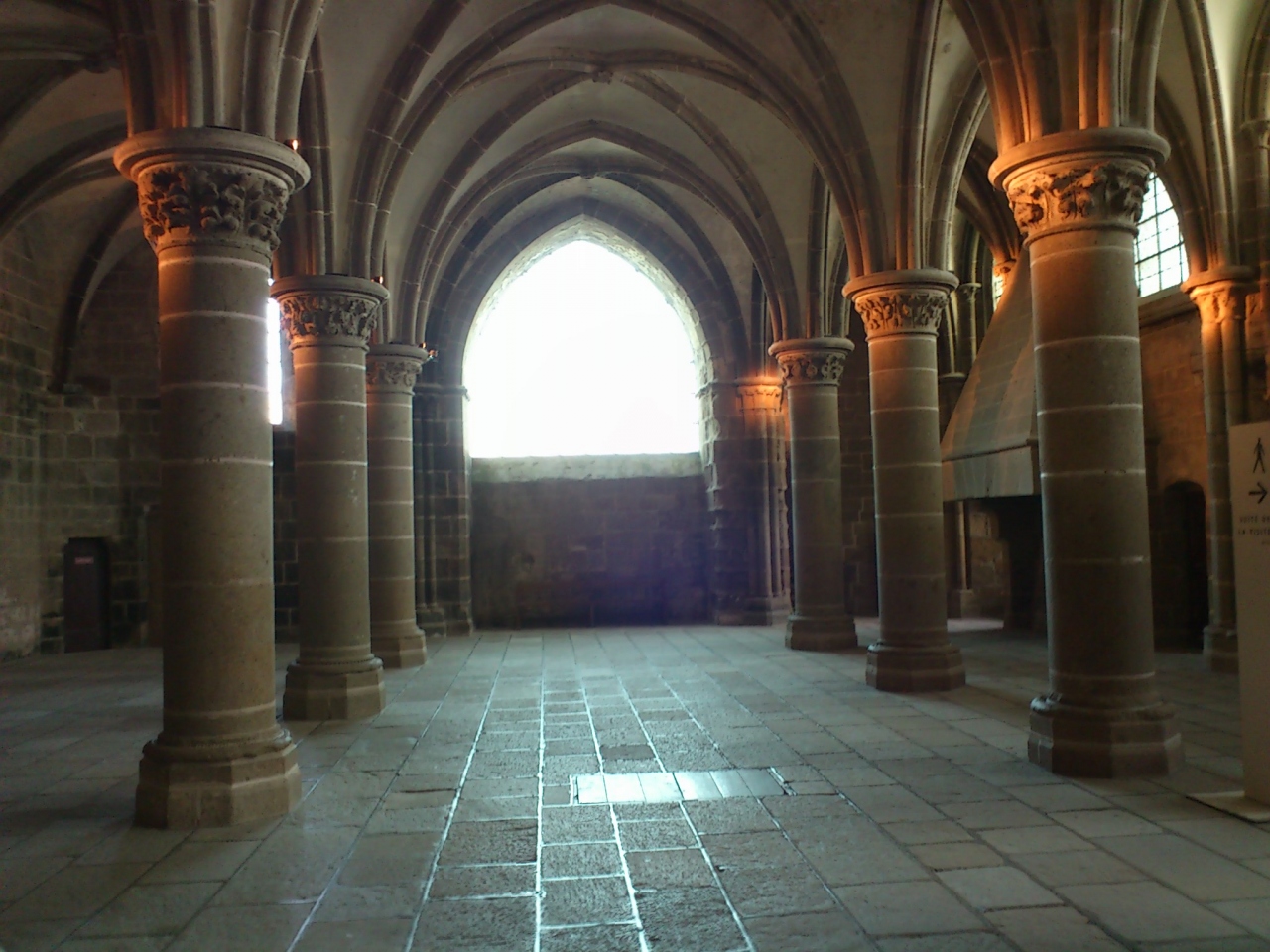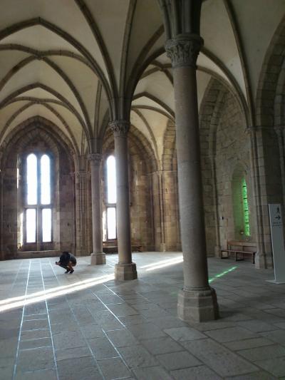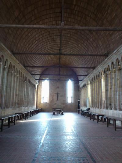 「ラ・メルヴェイユ(驚異なるもの)」という名前が付けられた北面にあるゴシック様式の3階建ての建物の3階部分にある部屋です。回廊のある中庭から続いて行くことができます。ここは修道士たちの食事室だった場所で、入り口から見ると窓が見えず、円柱しか見えないような特殊な配置になっています。ベネディクト会の戒律は非常に厳しく、食事時も無言で、コミニュケーションは手振りだったそうです。