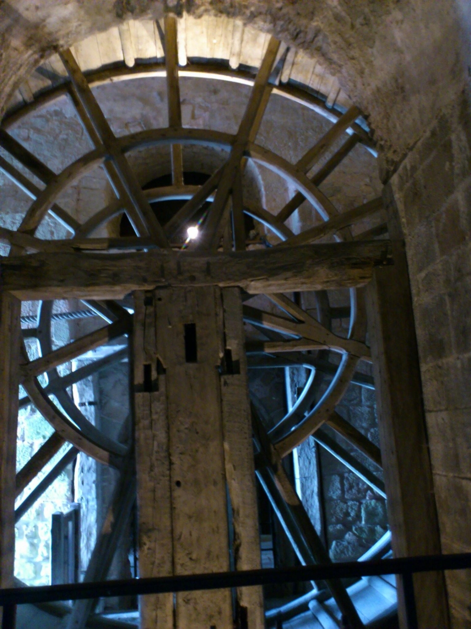 とても大きな車輪です。これを使って下から荷物などを引き上げるのに使ったそうです。この車輪の中に6人の男が入って、ハムスターのように車輪の中を歩いて、この大車輪を回転させたのだそうです。モンサンミッシェルが監獄として使用されていた時代に使われたものだそうです。
