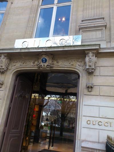 凱旋門を背にして、シャンゼリゼ通りをコンコルド広場に向かって下っていくと、まずは右手にルイビトンの本店があります。さらに先に10分ほど歩いて行き、モンテーニュ通りと交わる場所に、このグッチのお店があります。値段を比べると、日本より高いぐらいでした。