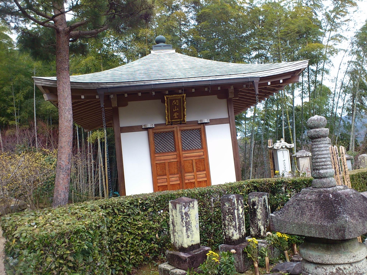 京都嵯峨野の紅葉の名所で、塀のない寺ともいわれる常寂光寺の中にあるお堂です。本堂を過ぎ、多宝塔の方へ上って行くと、そのさらに上にこのお堂があります。2004年に建立されたお堂なので、まだ新しい建物です。このお寺を開いた日上人坐像を安置しているそうです。