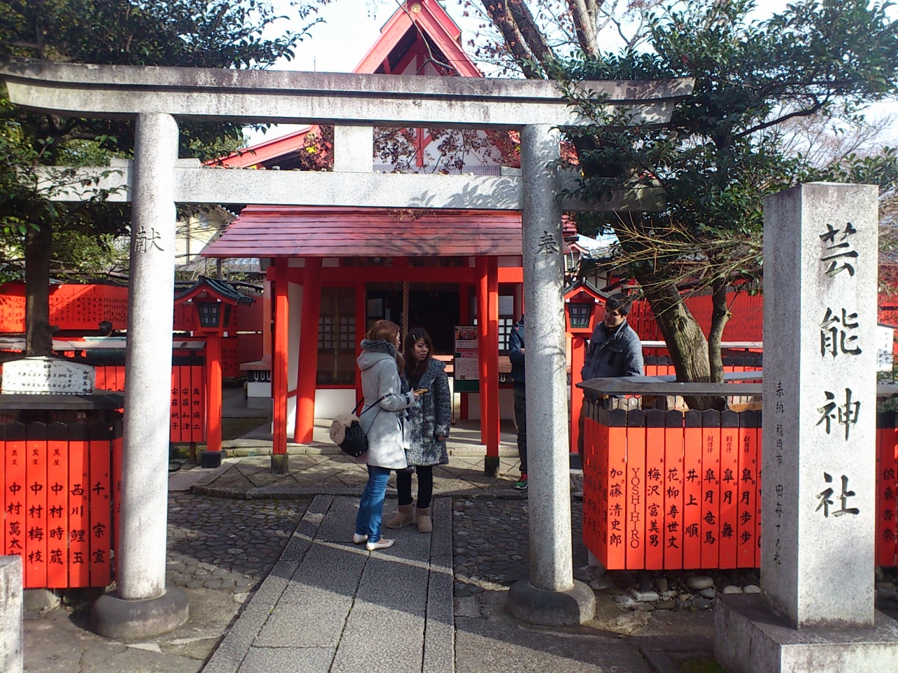 くるまざき神社と読みます。嵐山から嵐電に乗って、3つ目の駅で降ります。線路を跨いだらすぐに神社の入り口があります。清原頼業を祀っていて学問にご利益がある神社です。願が叶ったら自身で拾った石にお礼の言葉を記して返納するという風習があるそうで、本殿の前にいろいろな形の石が返納されていました。境内には芸能神社があります。