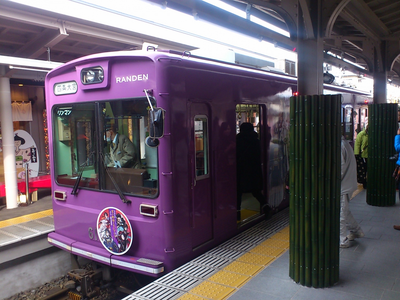 嵐山から車折神社まで嵐電に乗って移動しました。嵐山から3つ目の同じ名前の駅で降ります。料金は降りる時に前側の運転手さんの居る扉で払います。スイカ等のICカードも使うことができるので便利です。電車の中はほぼ観光客でした。