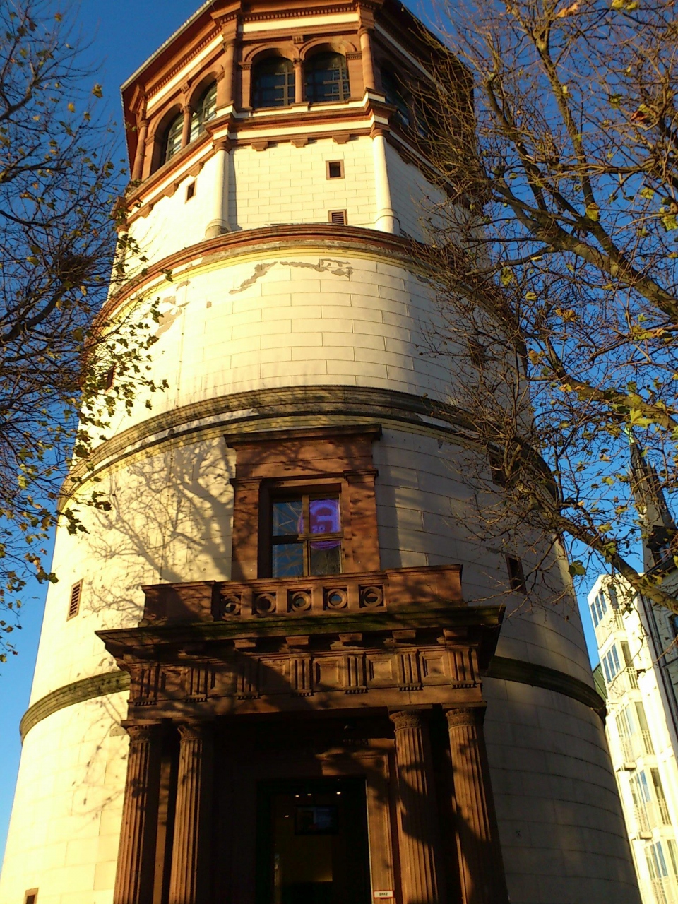 ライン川の川辺に建っている白い丸い塔で、現在は船舶博物館として利用されています。もともとはデュッセルドルフ伯爵の城の塔だったそうですが、第二次大戦で全ての建物が消失し、この塔だけが改築されたものです。近くのゴシック様式のランベルトゥス教会とセットでとても目立つ存在です。