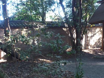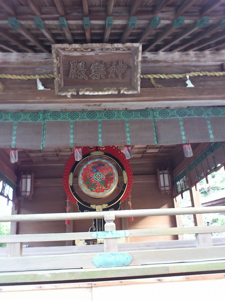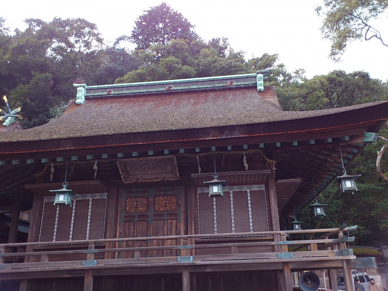 御本宮の目の前にはご神木のクスノキが生えています。その隣にこの神楽殿があります。建物は入母屋造・檜皮葺です。祭典の伶人楽や雅楽を奏する所です。雅楽で使う太鼓のようなものが、ぶら下がっています。赤い色でとても魅力的です。