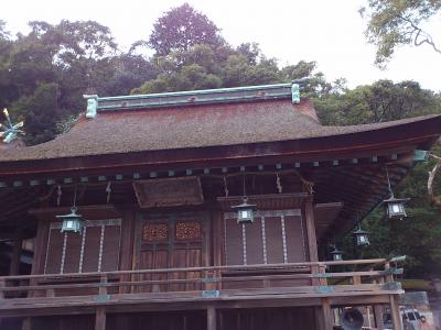 本宮の向かって右にこの神饌殿があります。入母屋造の檜皮葺です。祭典や毎朝夕に神前に献ずる神饌を調進する所だそうです。観光客のほとんどは御本殿の左にある三穂津姫社や絵馬殿の方へ進んでいくので、この神饌殿を見ている人は少ないです。みんな展望台から逆側の景色を見ています。