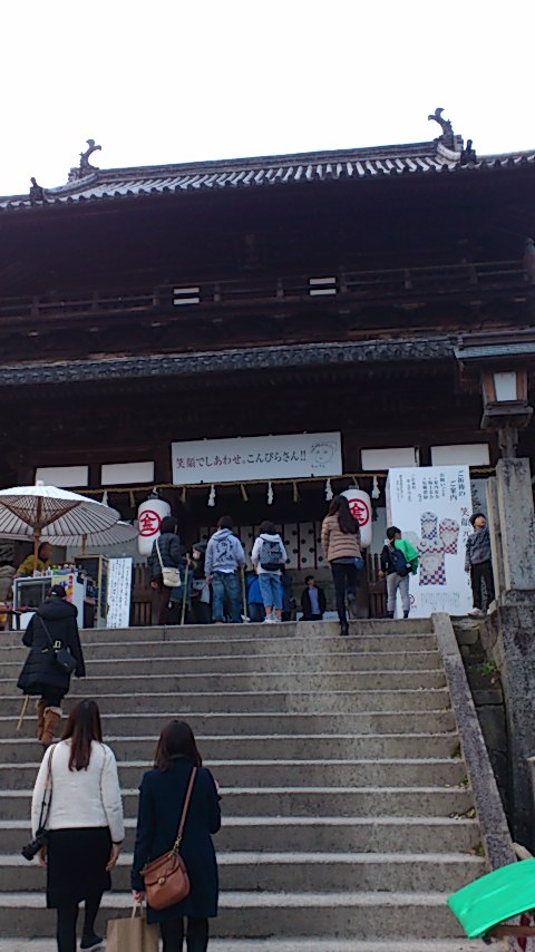 神馬のいる広場で一休みした後、また石段を登ろうとすると、かわいいこんぴら狗がいました。その後ろにこの桜馬場西詰銅鳥居があります。しあわせさん、こんぴらさんと書かれた黄色い布が垂れ下がっています。名前の通り、銅製の鳥居です。この後ろの石段を登りきると、社務所門が現れます。
