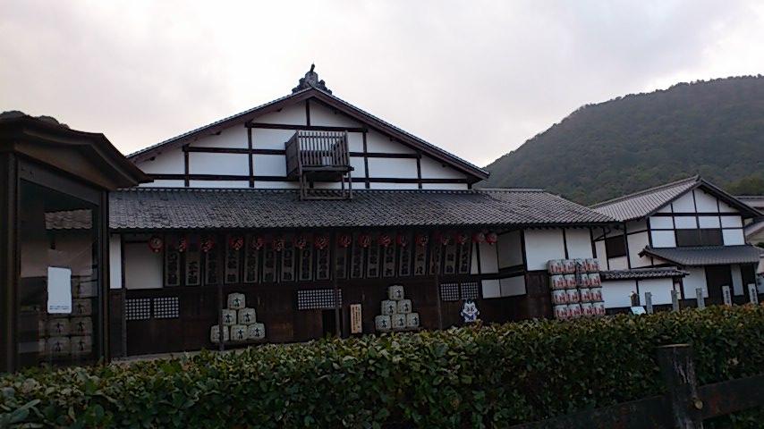 金比羅さんの参道の入り口付近にある金陵酒造が作った江戸時代の酒造りを再現した歴史観です。入館料は無料です。参道から中に入ると、大きな楠があります。建物の中には、大きな樽や酒作りの様子を人形で再現しています。