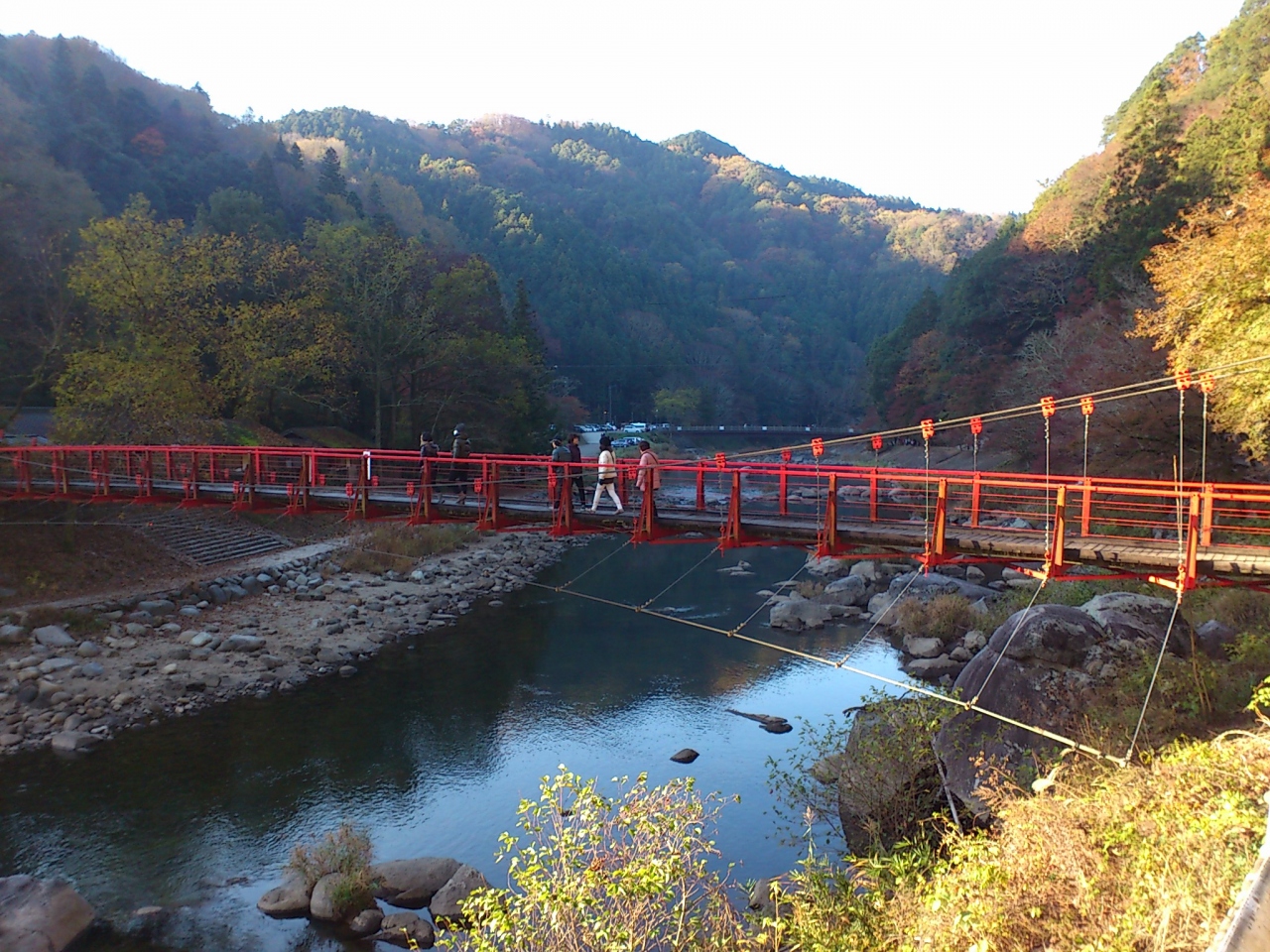 愛知県の中で一番有名な紅葉の名所の香嵐渓には、幾つかの端が架かっていて、どれも魅力的です。一番有名なのは赤くて綺麗な待月橋だと思いますが、この香嵐橋の周りの紅葉も素敵です。一番賑わいを見せる三州足助屋敷や香積寺を過ぎて更に奥に進むと、吊り橋が見えてきます。これが香嵐橋です。