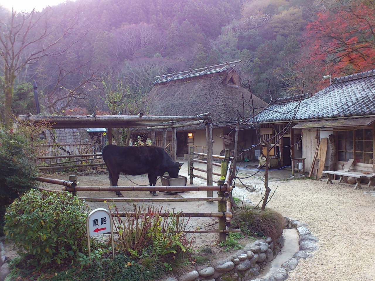 愛知県の中で一番有名な紅葉の名所の香嵐渓の中にある施設です。昭和55年に開館した施設で、かつての豪農屋敷を再現してあり、かつてこの地域で行われていた手仕事が行われています。開館は朝の8寺半で、入館料は300円。中に入るとすぐの場所に牛がいました。炭焼き、木地、紙漉き、機織り等が見学できたり体験できたりします。