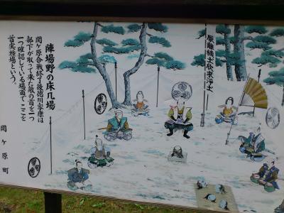 現在の関ヶ原町歴史民俗資料館の近くの陣場野公園の中にあります。白地の旗がはためいています。関ヶ原の戦いが終わって、首実検をしている家康の様子を描いた絵があります。戦況不利と見て、逃げるのではなく逆に陣を前に進めて、戦意を鼓舞するとは凄いです。