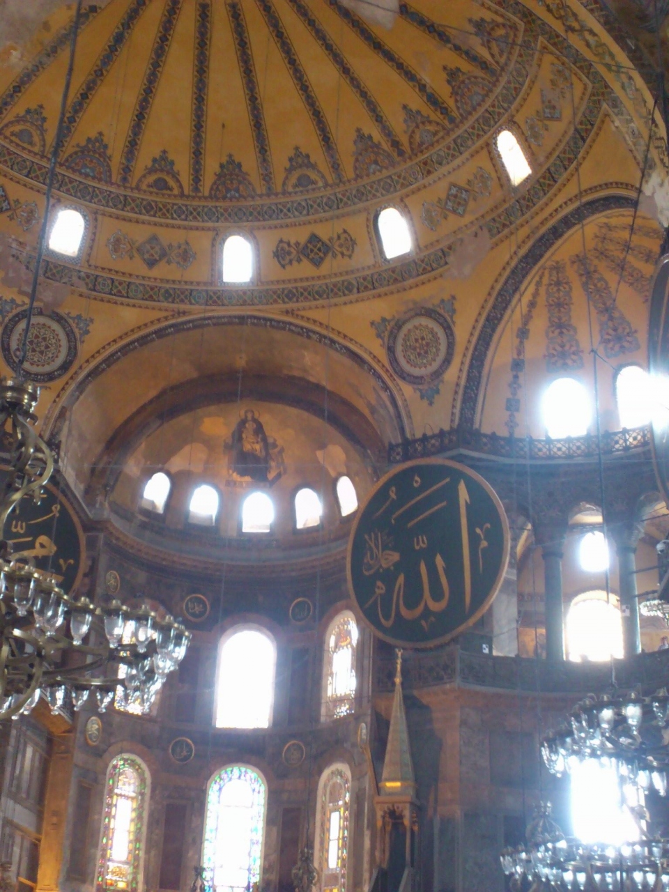 ブルーモスク、地下宮殿、トプカプ宮殿と見所が一箇所に集まっている場所にこのアヤソフィアも有ります。朝早くから他を見回った最後にお昼前にたどり着きましたが、長蛇の列でした。入場料は30トルコリラで、現金でもクレジットカードでも支払い可能です。もともとはキリスト教の教会だったものをオスマン帝国時代にイスラム教のモスクに改造したもので、今はモスクとしての機能はありません。下地を剥がして、何箇所かキリスト教時代に書かれた絵が出てきた場所を見ることができます。現役のモスクのブルーモスクほどの神聖さがありませんが、キリスト教とイスラム教が混在していて、個人的にはこちらの方が感動しました。
