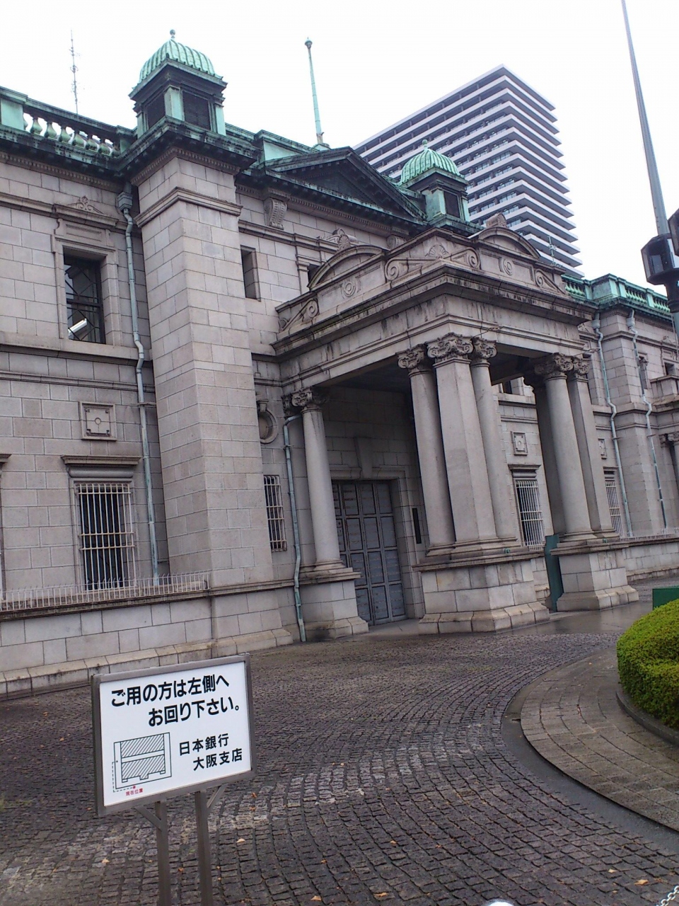 土佐堀川に架かる御堂筋にある淀屋橋を梅田側に向かって渡ると、左側に欧風なクラッシックな建物が見えてきます。看板を見ると、日本銀行の大阪支店でした。後で調べると、東京駅などを設計した有名な建築家によって、ベルギーの国立銀行をモデルにして建てられたものだそうです。とても趣があって良い建物です。