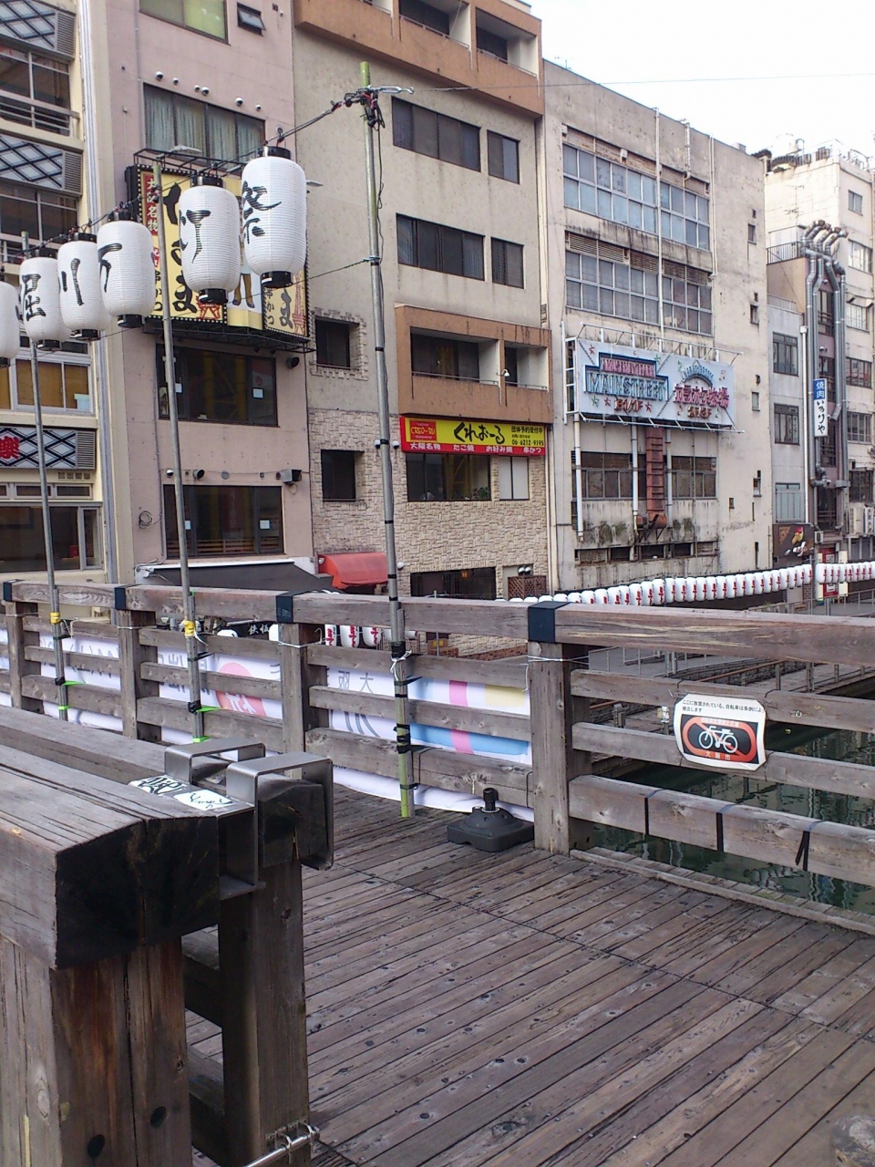 宿泊した心斎橋のホテルから南海難波駅まで歩いて行く途中で渡った橋です。ドンキホーテの近くです。大阪の地理には明るくないのですが、たぶんここが道頓堀だろうとは推測できましたが、木造の橋なので驚きました。とても趣のある橋でした。