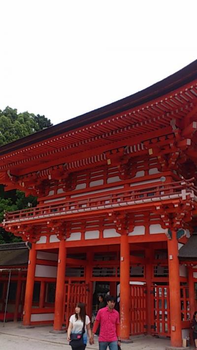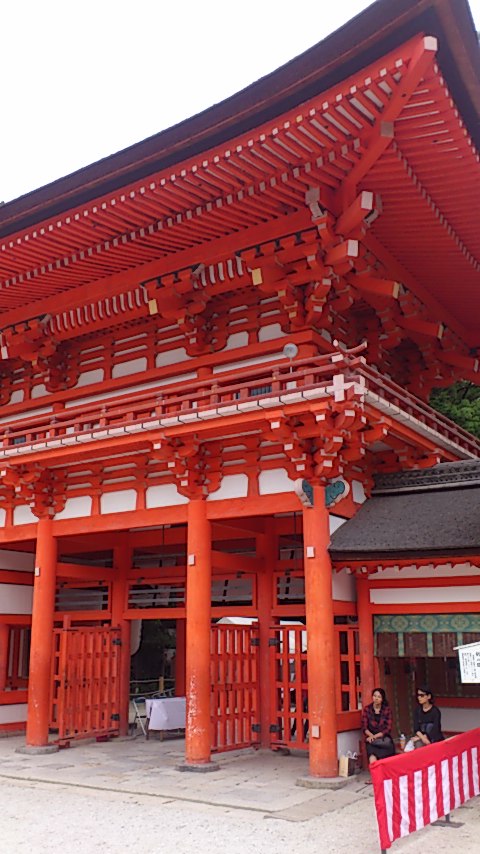 出町柳駅から徒歩での参拝です。糺ノ森に沿って参道を10分ほど進み、鳥居をくぐると今までの厳かな雰囲気と真逆の凄く鮮やかな朱塗りの門が現れます。国の重要文化財にも指定されている門です。名前の通り楼閣のような造りの門で、高さは20mもある立派な門です。