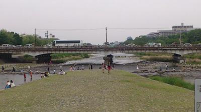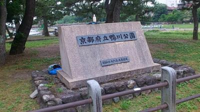 京都を流れる有名な鴨川の周辺に広がる公園です。比叡山参詣の帰り、出町柳駅を降り下鴨神社へ出かける途中、立ち寄りました。鴨川と高野川の合流している場所は三角形の形をしています。たくさんの人が公園や岸辺に居て、涼んでいました。