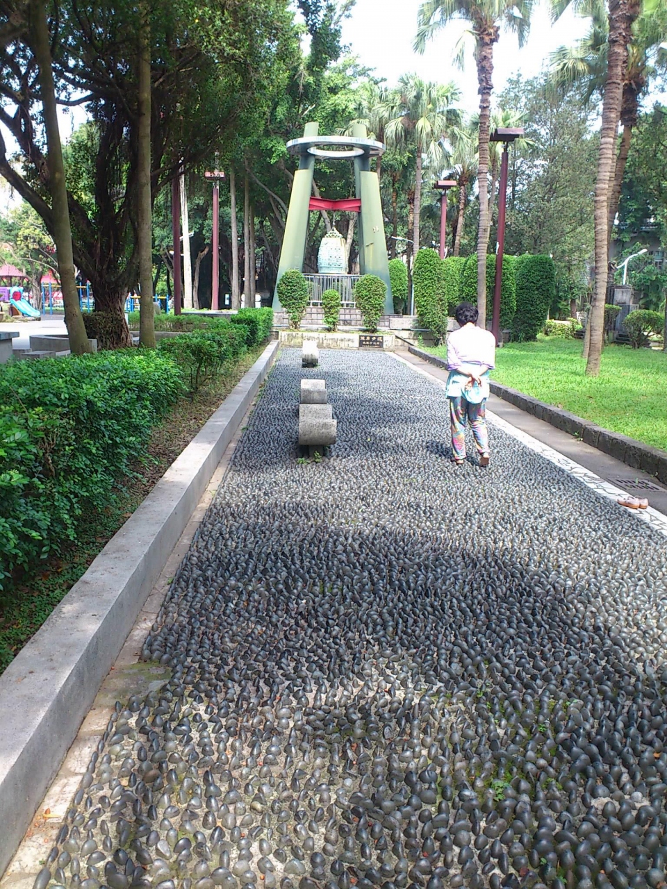 二二八和平公園は太平洋戦争後、中華民国に支配される事に反対した台湾の方が反乱を起こし、その時に犠牲になった方々を追悼するために名付けられた公園です。介寿公園の方から行ったので、公園に入ってすぐの場所にありました。近くには和平の鐘もあります。健康サンダルというイボイボの付いたサンダルがありますが、それの大型版です。凸凹の石の上を歩いて、足裏を刺激します。