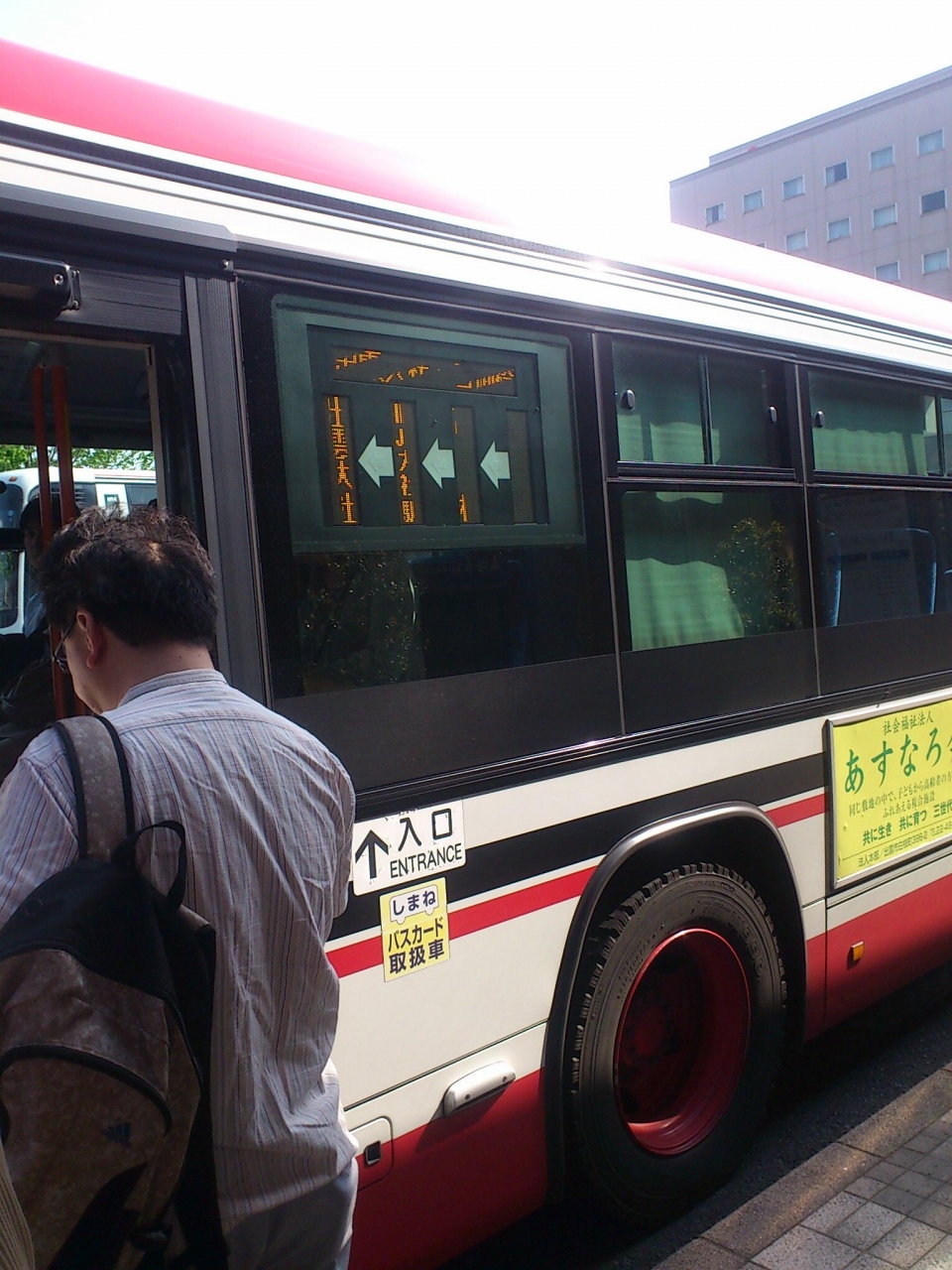 出雲市駅から出雲大社や日御崎へ移動するのに、一畑の路線バスを利用しました。この路線は30分に1本の間隔でバスが走っています。スイカやパスモなどのICカードは使えませんので、観光客は現金払いがほとんどですので、小銭の準備が必要です。1000円札は両替できますが、5千円・一万円札は乗車前に両替が必須です。