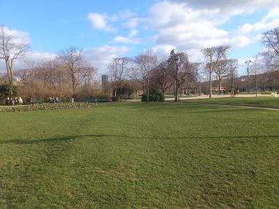 エッフェル塔のセーヌ川の反対側に東南の方向へ細長く広がる公園です。芝生の植えられた広場がよく手入れされており、たくさんの人が歩いたり、寝そべったりしてくつろいでいます。ここから少し離れたところから見るエッフェル搭は、高さが強調されます。