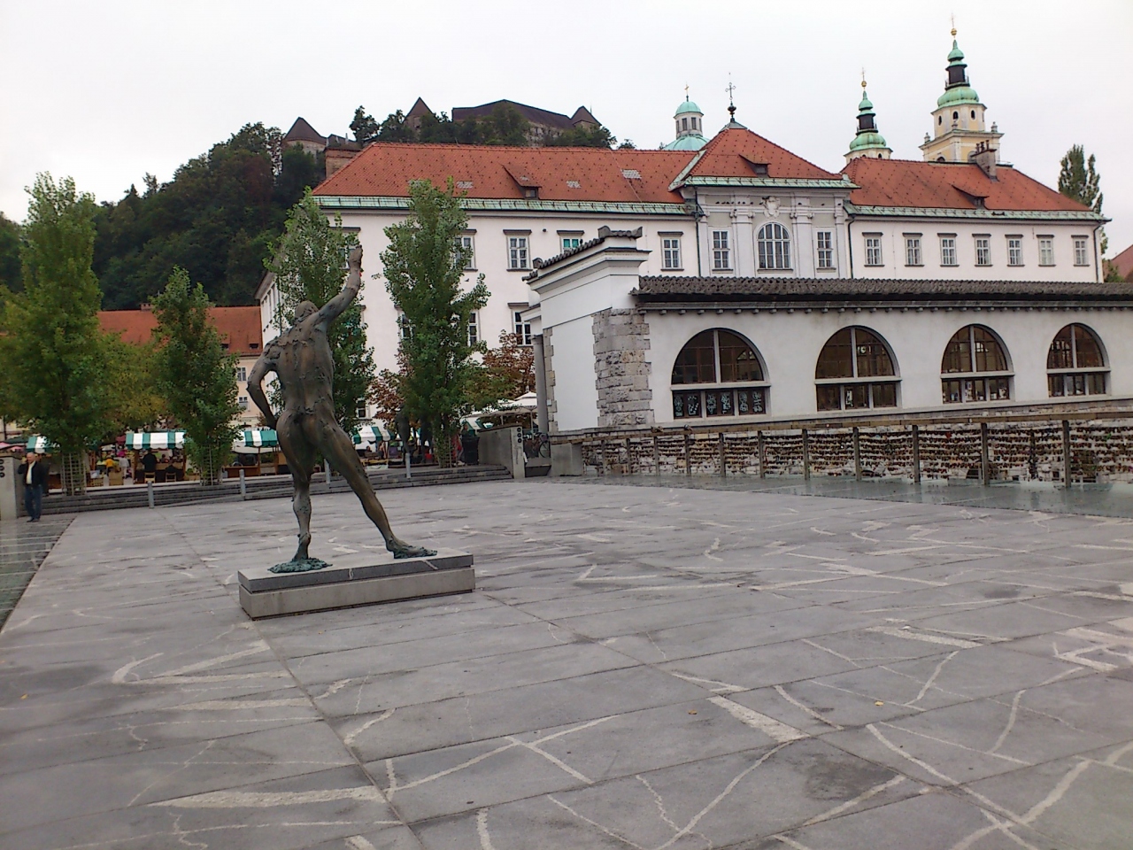 リャブリャナ観光の1番の目玉の場所です。と言っても、他の見所もこの近くに固まっているので、リャブリャナ観光は1時間も掛からないような小ささです。名前の通りに3つの橋が1箇所にかかっています。真ん中の橋だけが車が通行可能で、左右の小さな橋は歩行者専用です。白い色が周りの景色の映えます。