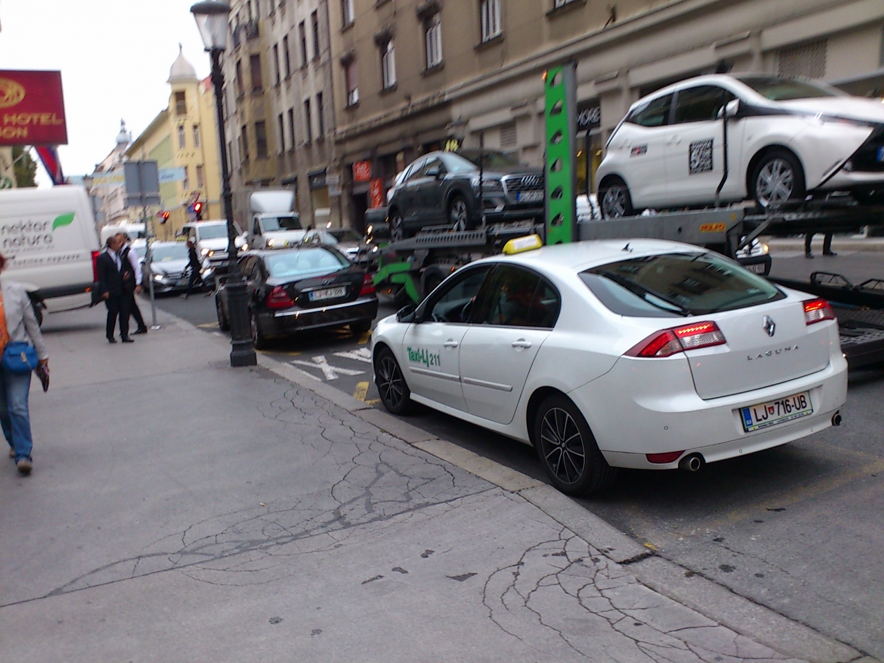リュブリャナで宿泊したラディソン ブル プラザ ホテルから、町の中心部までの往復をタクシー利用しました。 リュブリャナでは街であまりタクシーを見かけません。ホテルではタクシーを呼んで貰いました。日本式に後ろの座席に乗ろうとしたら、運転手さんに助手席に乗れと言われました。メーターがなかったので心配でしたが、20分ほどの乗車の後に料金を聞いて見ると5ユーロでした。帰りは三本橋トロモストヴイエなどがある本当の中心部には、タクシーが入れないようで、近くのタクシー乗り場を探して乗りました。帰りは道も空いていたので同じ5ユーロだと思ったのですが、10ユーロ請求されました。