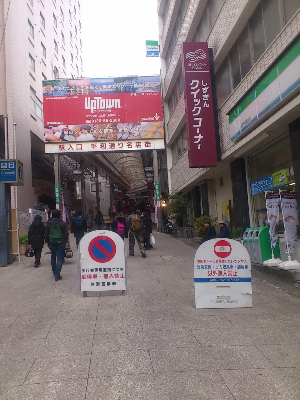 熱海には2つの大きな商店街があります。仲見世商店街とこの平和通り商店街です。熱海駅からみると、仲見世商店街の入口の方が目立つからか、そちらの方が賑わっています。熱海の海辺の方から熱海駅の方へ坂を登ってくると、先にこの平和通り商店街の入口が出てきますので、駅へ登ってくる観光客は、こちらの方が多いようです。