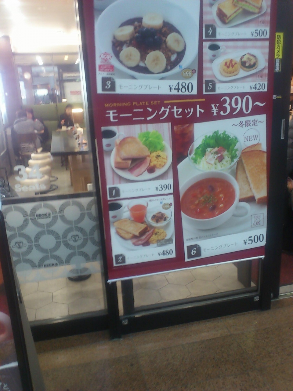 小田原駅構内には、エクセルシオールとこのベックスコーヒーとカフェが2つあります。次の電車の時間まで、どちらかでモーニングを食べようと考え比較しましたが、このお店の方が美味しそうなモーニングがあったので決めました。コーヒーにトーストとスクランブルエッグとサラダが付いて390円だったのでお得でした。