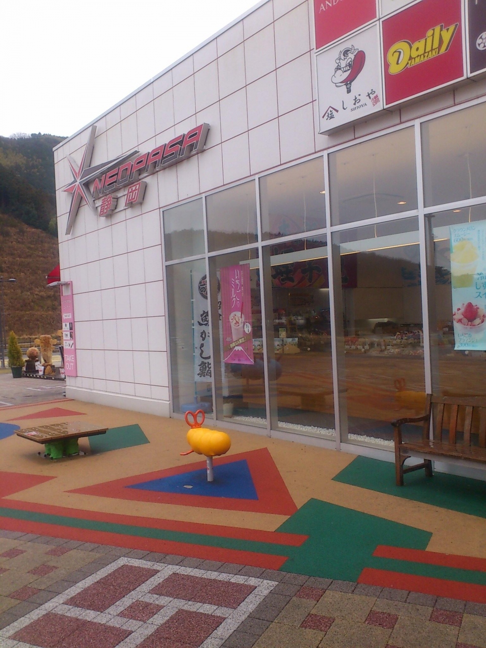 普通、SAやPAは道路の左側にありますが、このSAは道路の右側にあります。とは、言ってもSAへの道は左側に降りて行った後、大きく迂回し、道路の下のトンネルを通って、上り車線側へ行くことになります。それでか、細長い形になっていて、駐車場も手前と奥の2箇所に分かれています。ですので、手前がすぐいっぱいになり、困っている方が大勢いました。