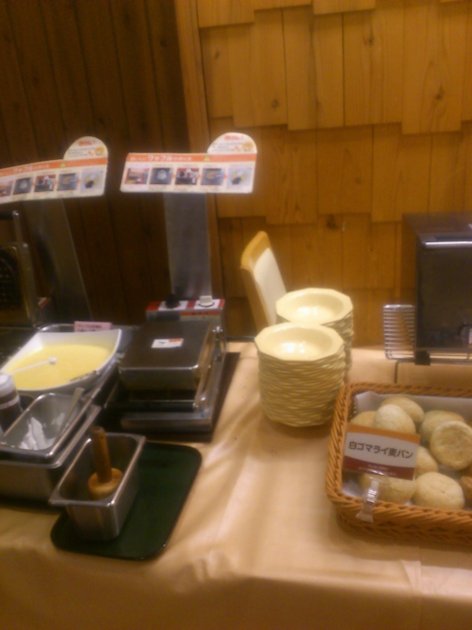 名東区のよもぎ台にあるお店です。朝食バイキングをやっているということで行ってきました。お店自体は、ファミレスのチェーン店です。まず入店すると料金を先払いします。少し高いです。バイキングは、洋食系と和食系があります。ワッフルは自分で焼くことになります。約1分で焼き上がります。