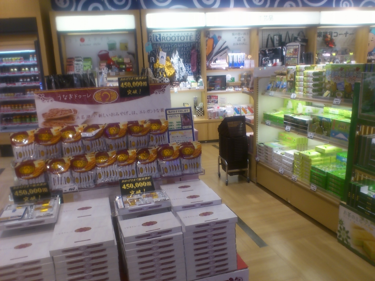 新東名のパーキングエリアのエウパーサ浜松内にあるお土産屋さんです。遠州鉄道が経営をしています。浜松と言えば、うなぎやピアノが有名ですが、このパーキングの建物はピアノを模して作られています。お店はお土産物だけでなく、ちょっとした飲み物やオヤツのようなものも売っているので、このお店だけで全てが済みます。定番中の定番ですが、お土産でうなぎパイを購入。
