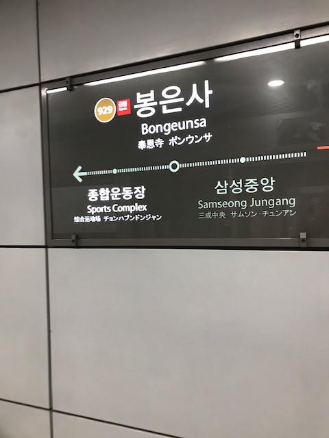 文字通り、奉恩寺に行くために利用した9号線にある駅です。駅を出てすぐのところに奉恩寺があります。太い道路の反対側にはCOEXモールがありました。奉恩寺とCOEXモールという見所が2つもある珍しい駅です。
