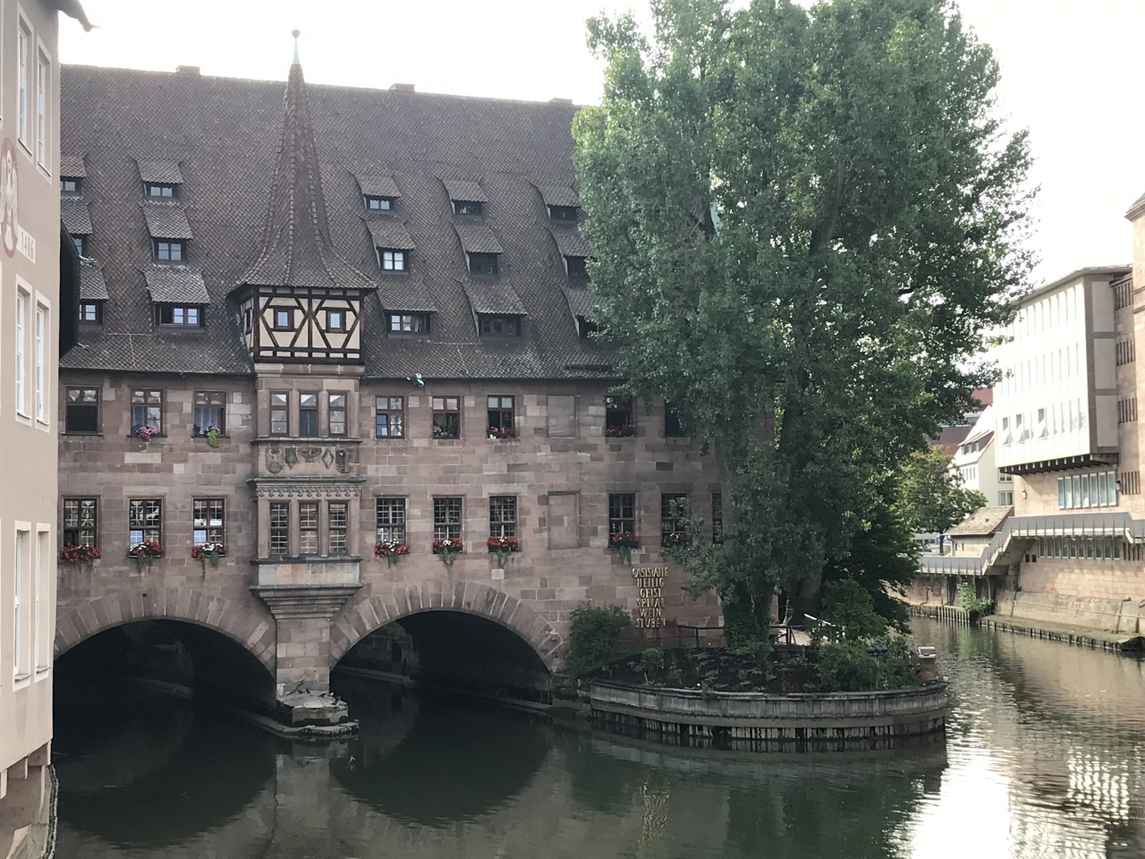 ニュルンベルグの中央駅近くのホテルからケーニッヒ通りを歩いてニュルンベルク城へ向かいました。ベーグニッツ川にかかるムゼウム橋の近くに旧救済院だったハイリヒ ガイスト シュピタールがあります。今はレストランになっています。ニュルンベルグの紹介でよくこの建物の写真が使われるぐらい有名な建物です。