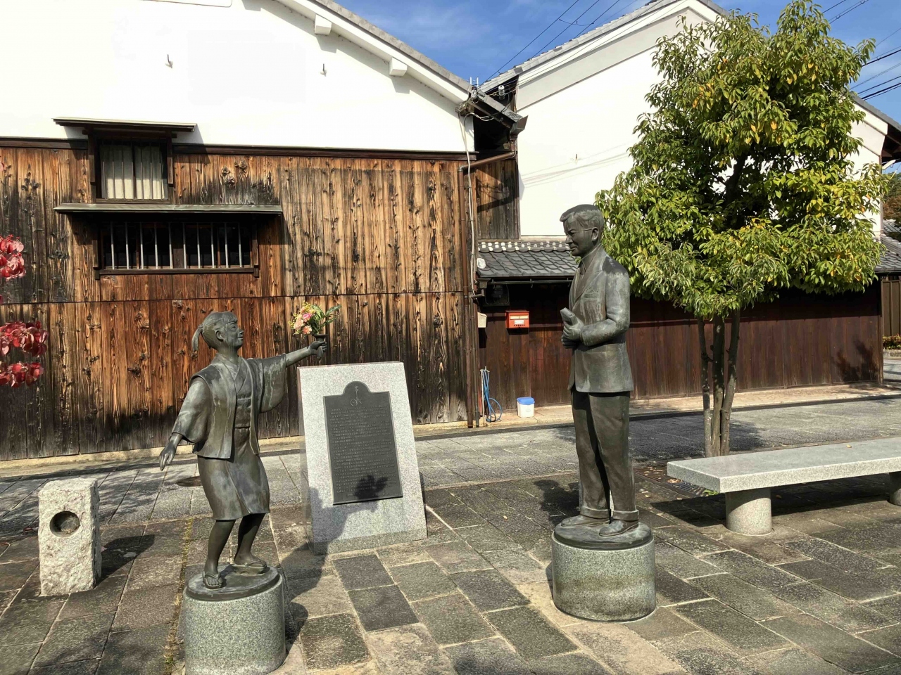 メンソレータムで有名な近江兄弟社資料館に行こうとしたら、道路の反対側に小さな広場があり、そこに少女が花束を外人さんに渡している像がありました。外人さんはヴォーリズさんだそうです。微笑んでいて、とても優しそうな人柄の人だったんだろうなと思いました。